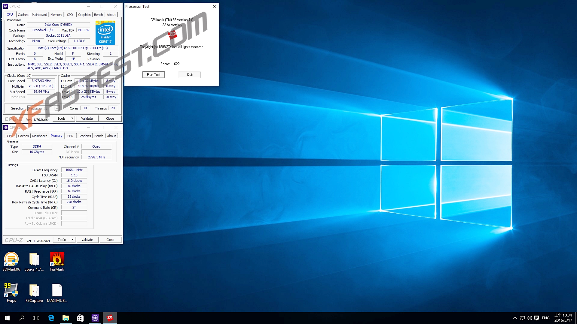Intel i7-6950X預設頻率3.0GHz,Turbo后可達3.5GHz,L3快取為25MB,內存起始頻率2400MHz,內存部分可以超頻,而這次筆者將內存頻率定于2133MHz,時序為16-16-16-35-278 2T。Intel i7-6950X 3.0GHz Turbo 3.5GHz 內存2133MHz效能測試CPUmark:622(i7-5960X CPUmark:585 )