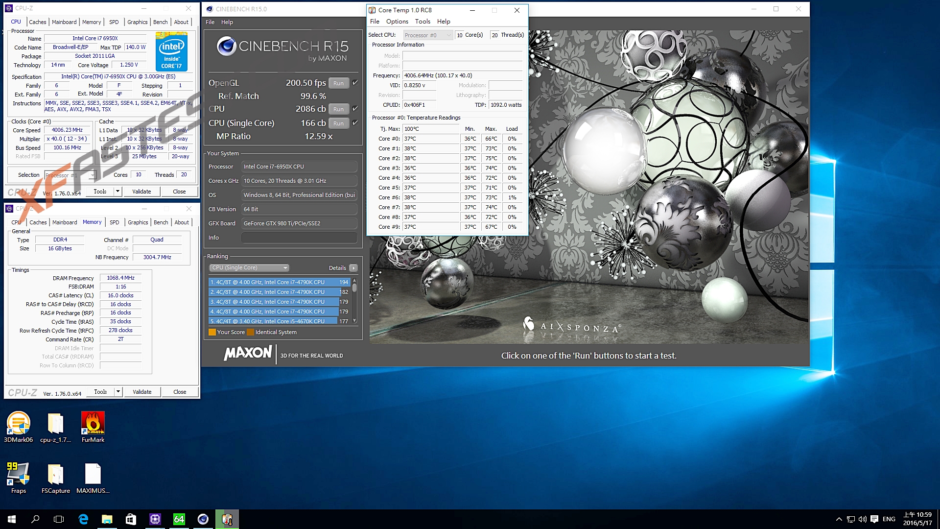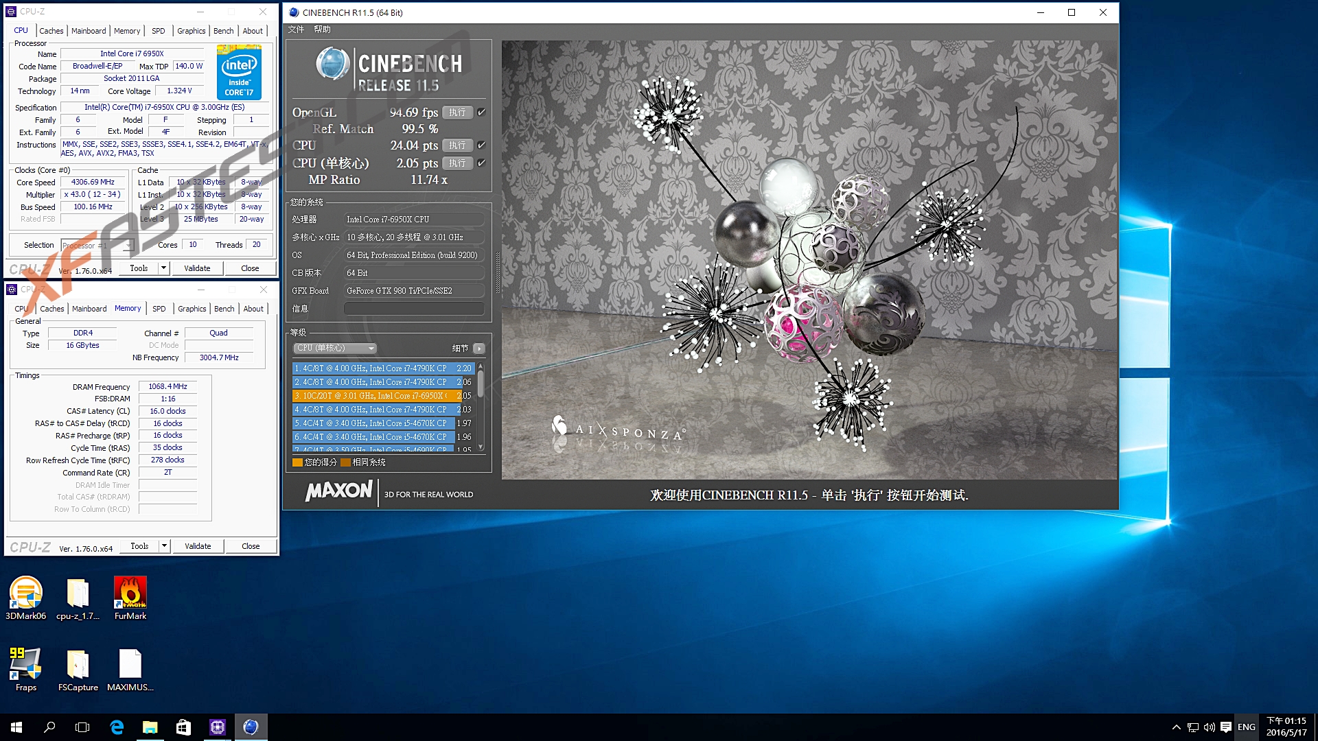 CINBENCH R15 CPU:2086cb(i7-6950X 3.5GHz 1862cb)