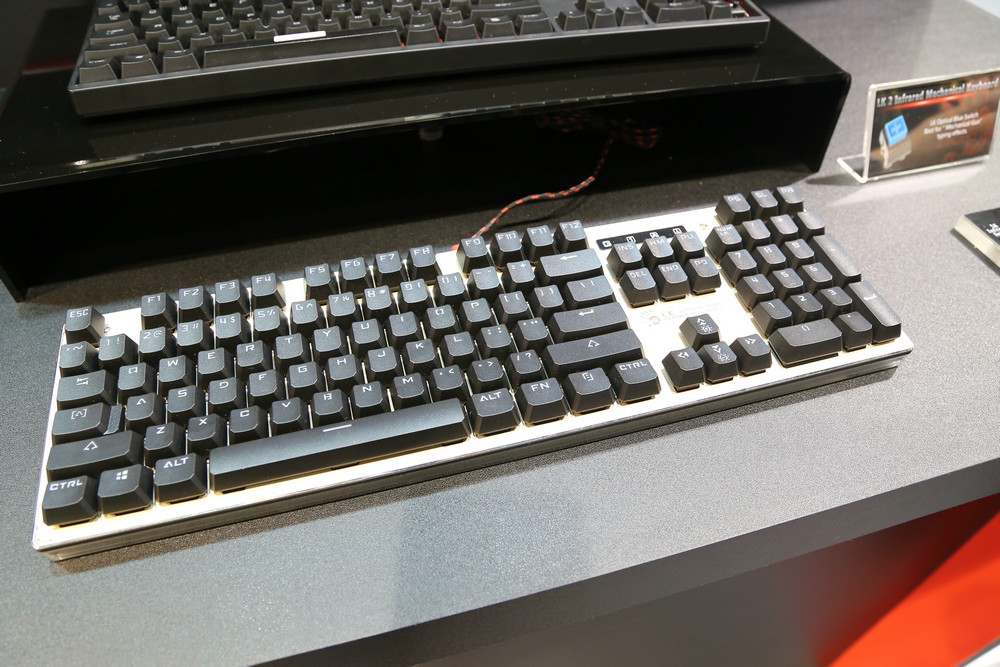 本次COMPUTEX 2016,血手幽靈展示了一款新品鍵盤——B830光軸機(jī)械電競(jìng)鍵盤,光軸二代采用紅外光切割原理取締了傳統(tǒng)機(jī)械軸的金屬簧片結(jié)構(gòu),從根部解決了金屬機(jī)械軸的魔磁與抖動(dòng)雜訊問(wèn)題,其采用的光速出擊技術(shù),將金屬接觸點(diǎn)使用IR(紅外發(fā)光管)、PT(紅外光敏管)代替,利用紅外光瞬間遮斷閉開(kāi)原理,實(shí)現(xiàn)信號(hào)的感應(yīng)。沒(méi)有了金屬觸點(diǎn),那么彈跳噪聲自然也不會(huì)產(chǎn)生,信號(hào)輸出波形完全零彈跳雜訊,完全沒(méi)有延遲時(shí)間,可達(dá)到極限的0.2ms響應(yīng)時(shí)間,以光速傳導(dǎo)信號(hào),比機(jī)械鍵盤觸發(fā)快30%,比常規(guī)的薄膜鍵盤快50%。最重要的是光軸不會(huì)像金屬一樣氧化,從而杜絕了金屬氧化雙擊的問(wèn)題,按鍵點(diǎn)擊壽命高達(dá)上億次。