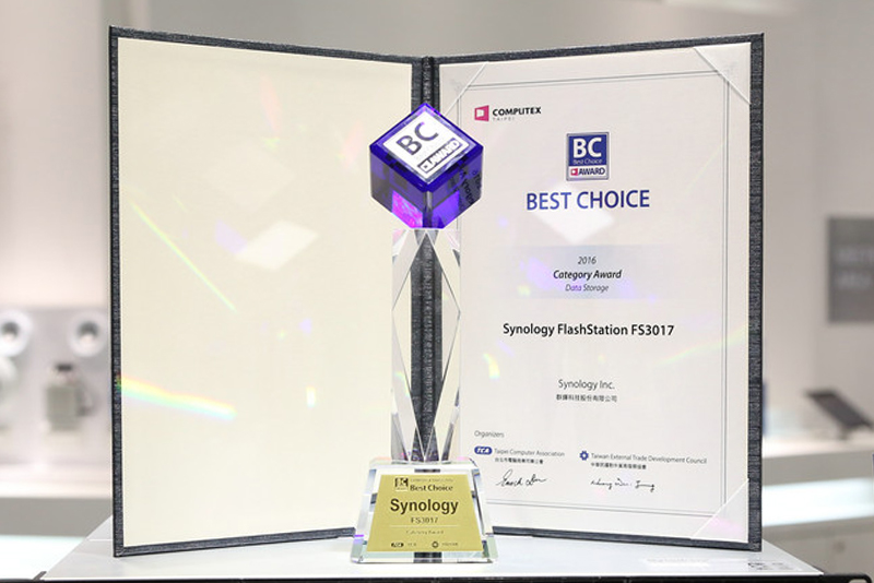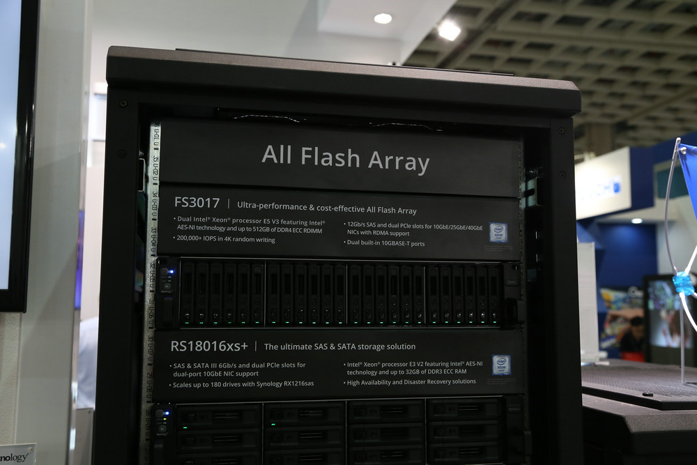 最引人注目的便是FlashStation FS3017 SSD陣列。這個大家伙竟然是個完全以SSD為存儲介質的服務器。這個家伙的性能自然不用多說,然而更令人驚訝的則是群暉竟然克服了SSD壽命以及數據安全性。所以FS3017也獲得了COMPUTEX頒發的存儲類“Best Choice”獎。