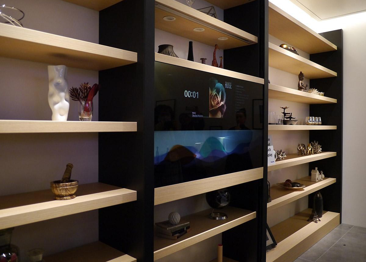 這款電視的厲害之處在于當(dāng)電視處于關(guān)閉的狀態(tài)時(shí)可以看到擺放在電視背后的東西,這項(xiàng)技術(shù)的關(guān)鍵在于木框中安裝了微型LED可以將畫面投射到玻璃面板上,通過透明化的屏幕可以看到隱藏在后方的各種物品。
