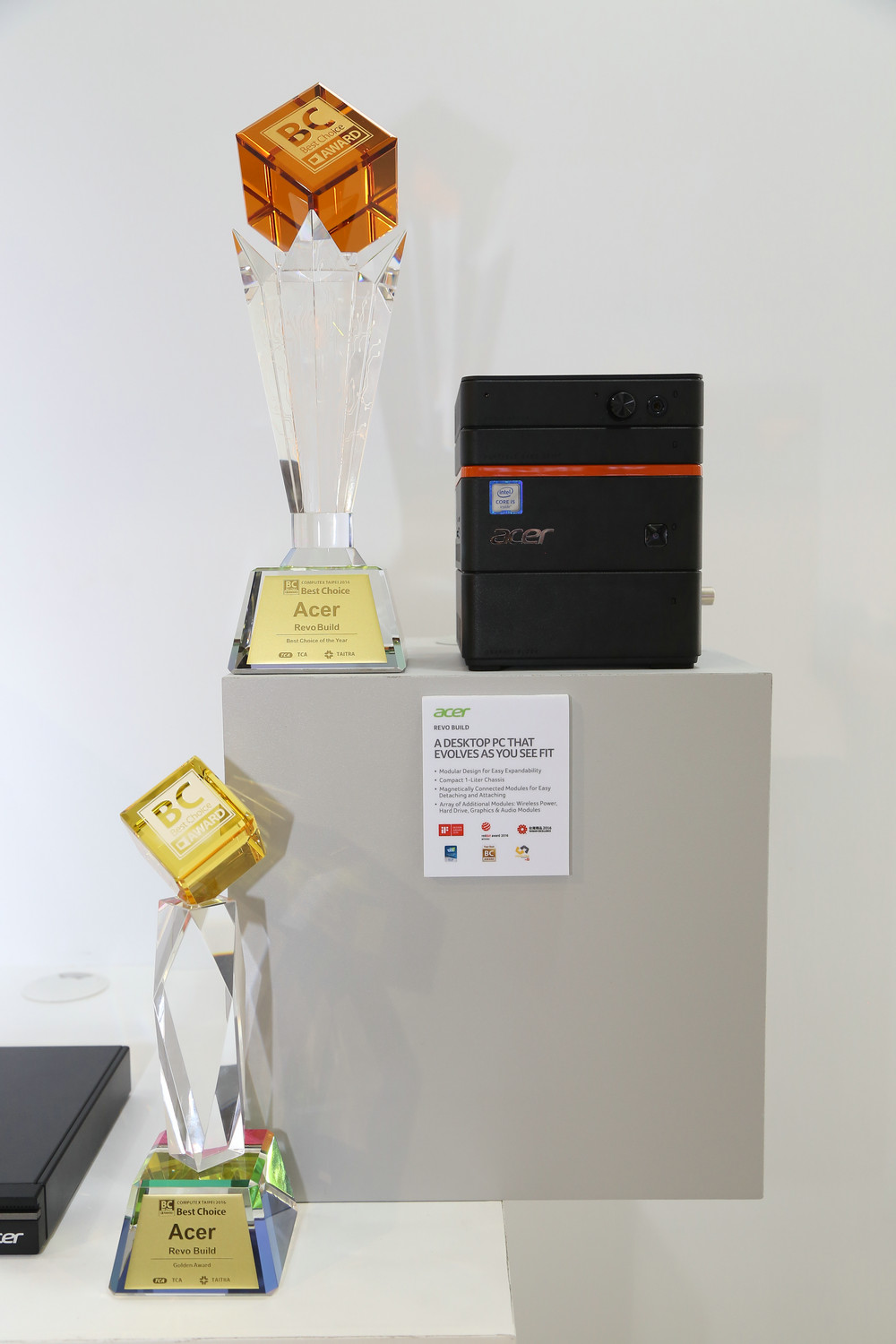 Acer迷你PC-RevoBuild,其小巧的外型和客制化的彈性模塊設計是最大特色,小巧的一升體積,不占空間且可靈活擺放在各式空間;它的設計理念是源自積木堆棧的理念,用戶可依自身需求,在原有主機方塊之上,透過快拆磁吸設計(magneticconnectors),輕易擴充各式積木模塊。