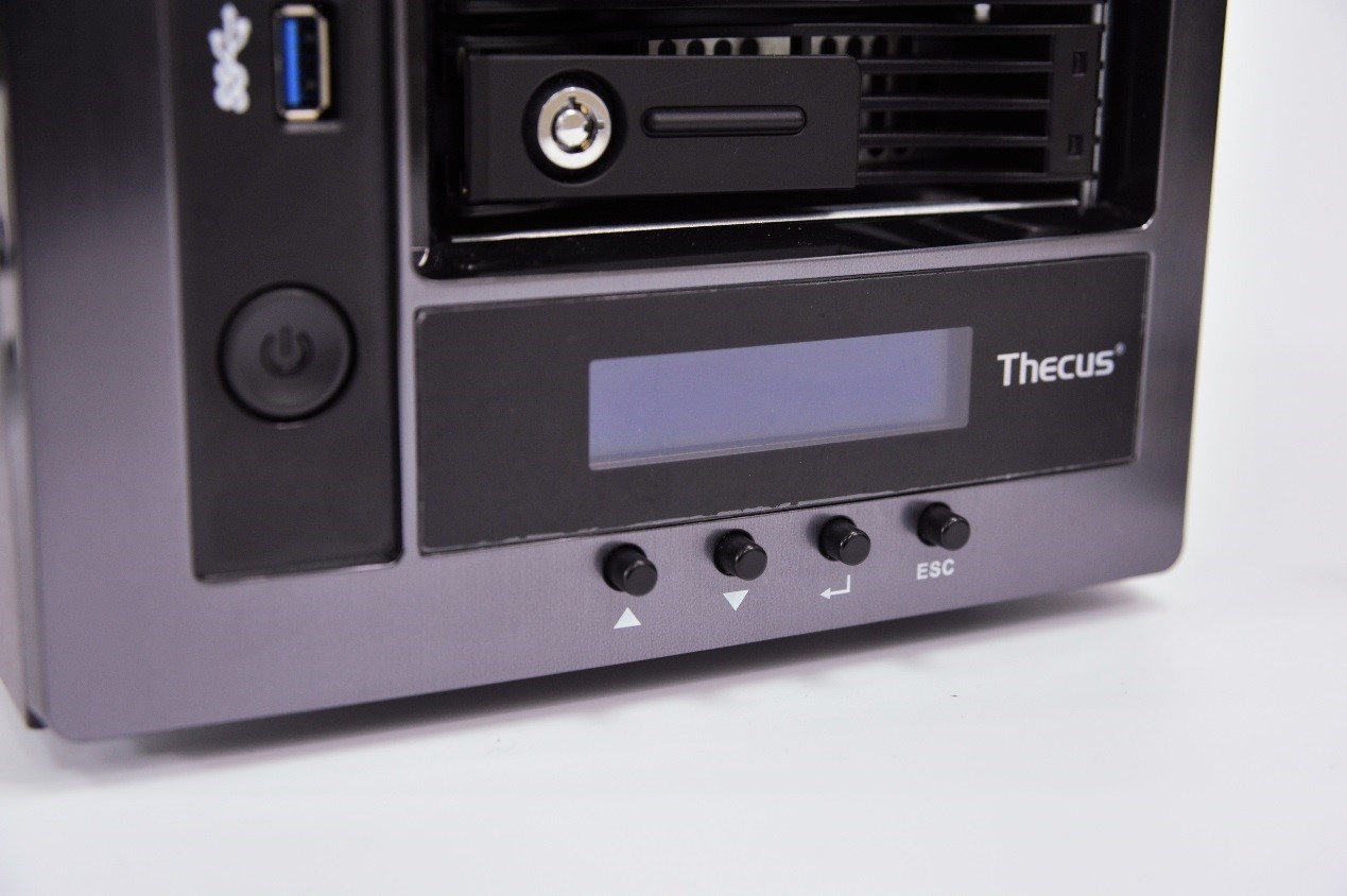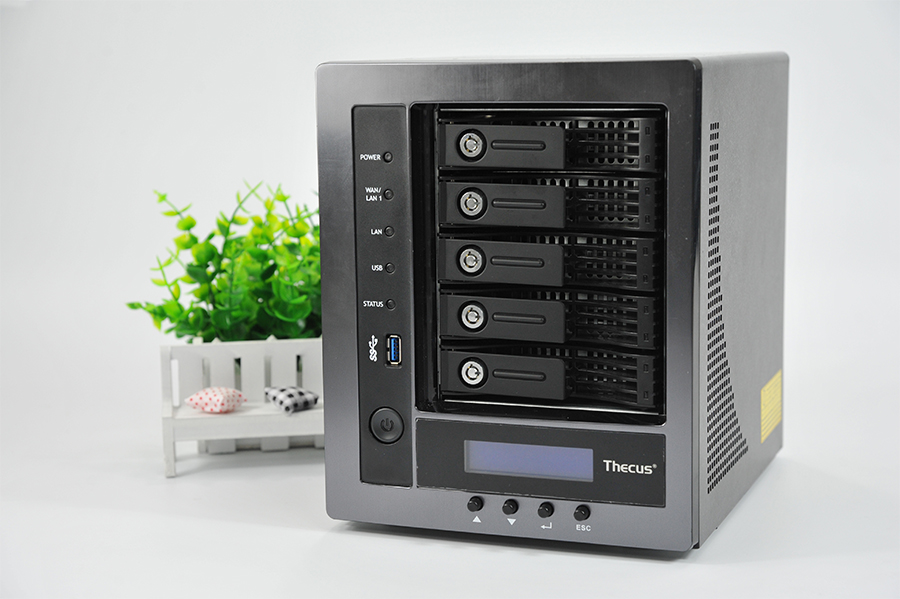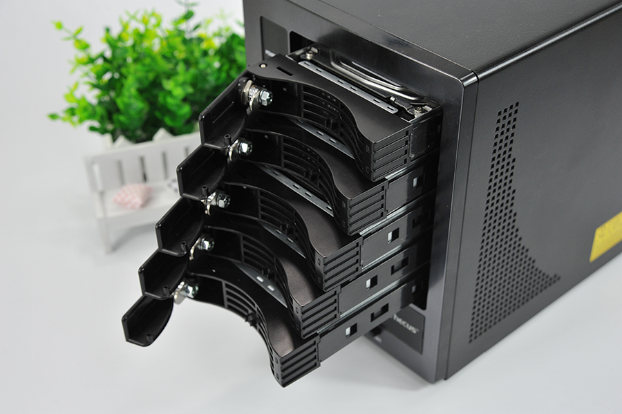 正面擁有1個USB 3.0接口,5個支持熱插拔的硬盤位