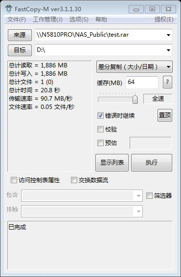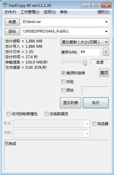 N5810 pro的功能十分全面,FTP,SSH,SNMP,VPN,UPnP等功能一個不少,畢竟作為一臺旗艦級NAS,擁有這些功能是理所當然的。為了測試性能,我們用Fastcpy測試一下N5810 Pro在局域網SMB的傳輸數據。