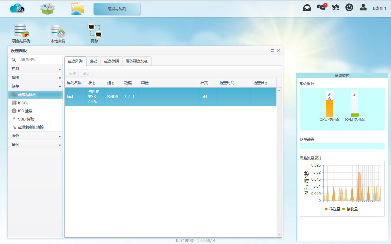 等RAID組建完成我們就可以開始使用了,首先介紹一下系統設置,感覺N5810 Pro比較有特色的是系統監控信息,可以看到硬盤的總讀取量和總寫入量,還可以監控NAS的CPU,內存,硬盤,網絡的實時情況。其次還支持網絡喚醒,對路由稍微設置還可以遠程喚醒,非常方便。