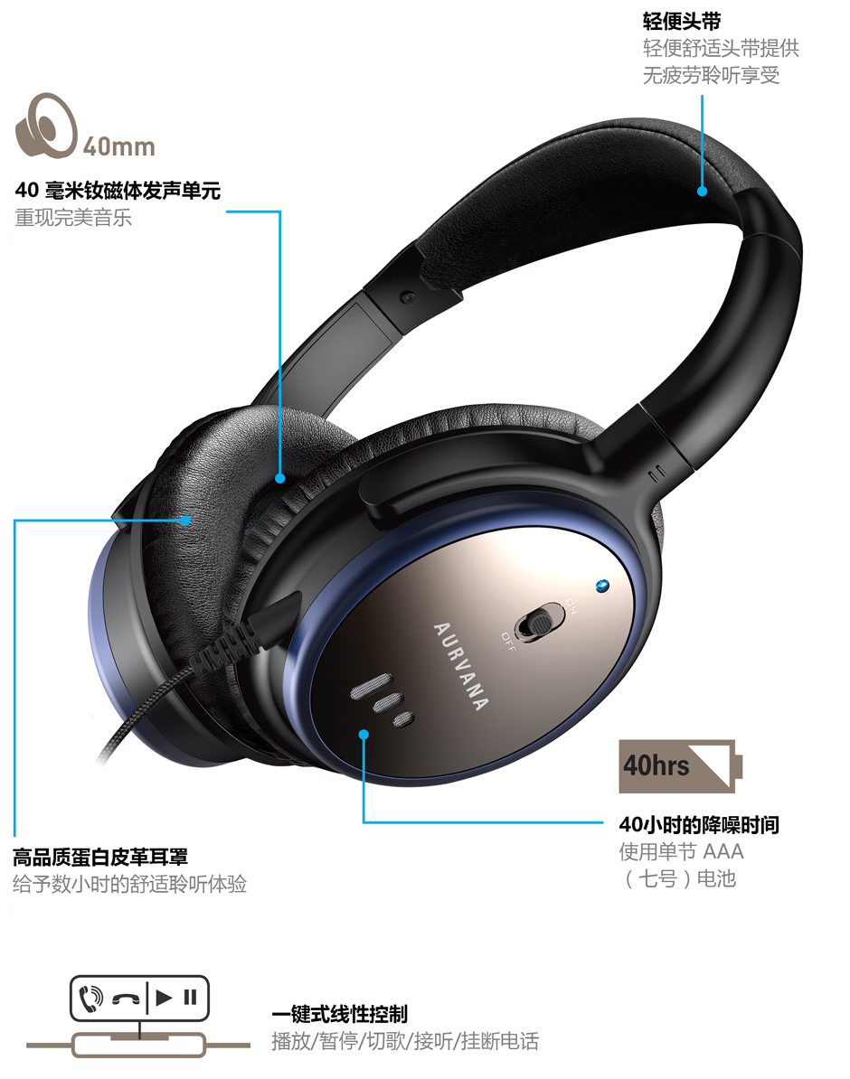 這款AURVANA ANC主動降噪耳機采用專業調校的 40 毫米釹磁體發聲單元耳機,頻率響為20Hz ~ 20kHz,而在主動降噪功能開啟時阻抗為290歐姆,官方稱這款AURVANA ANC耳機的主動降噪效果可達到87%,當 ANC 功能開啟時,耳機內的 AAA 堿性電池可支持長達 40 小時的連續播放。當電量用盡時,您的音樂同樣能正常播放。
