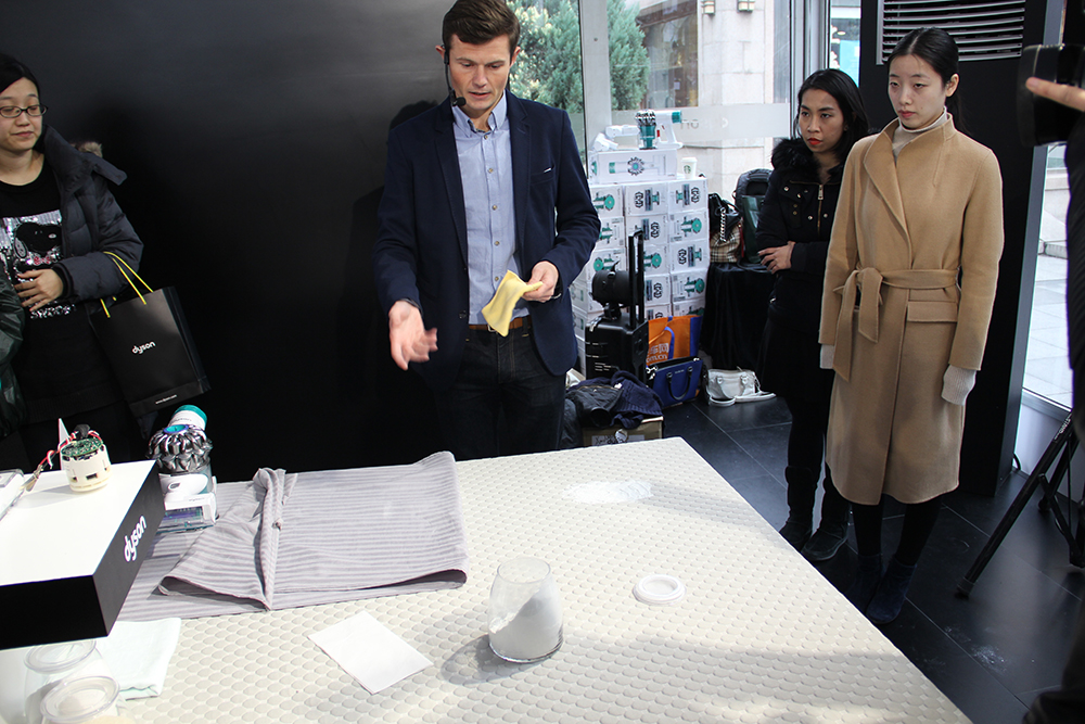 第二個實驗是實際使用效果測試,戴森工作人員先把爽身粉撒在床墊上,然后用多層毛巾,桌布遮蓋住粉末,在最上層使用V6 Mattress吸塵器,幾秒鐘后最底下的粉塵被吸得一干二凈,猶如隔空取物。