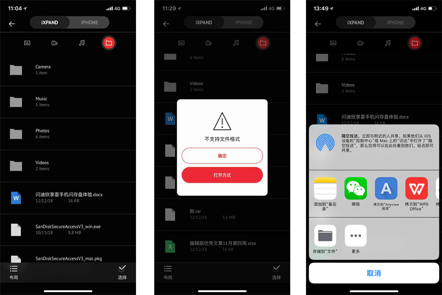 如果你有在手機上讀文件的習慣,也可以將電腦里的Word,Excel文檔拷貝其中插上手機瀏覽。我使用的時候發現,就算文件沒有放在指定文件夾內,它也會出現在iXpand列表里,點擊就能打開,但并不支持編輯,所以只能解眼饞。另外我實在好奇它兼容文件格式臨界點在哪,所以我毫無節操的放入了rar壓縮文件,這次真的難到它了,直接蹦出了不支持文件格式,不過還是可以使用第三方軟件解決。