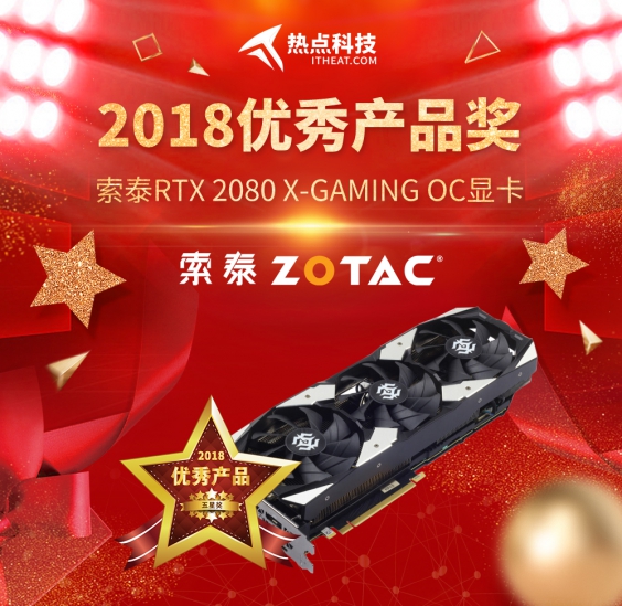 祝賀索泰RTX 2080 X-GAMING OC在熱點科技2018五星獎頒獎盛典中榮獲:優秀產品獎