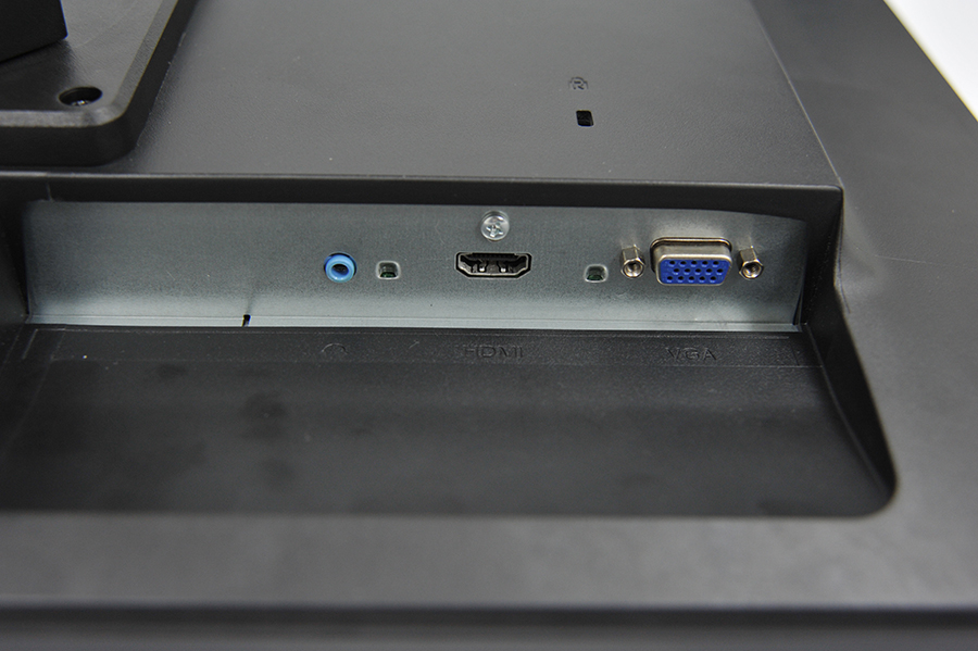 在顯示器的一側提供了VGA與HDMI雙接口,同時配有一個耳機插孔。顯示器底部另一側的電源插孔。