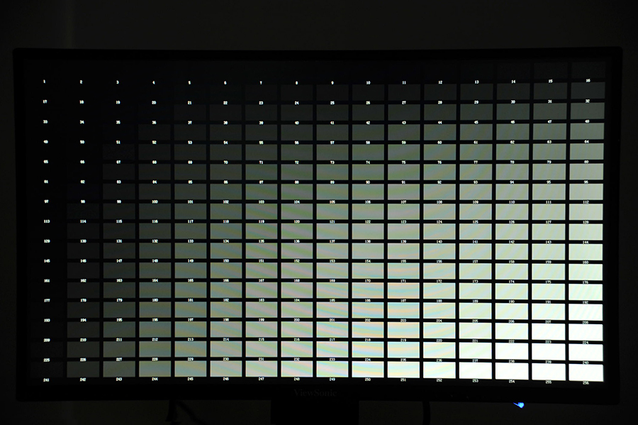 我們通過灰階測試了VG2450明暗對比和黑白顏色過渡方面的表現(xiàn),從上圖可以看出VG2450在256級的灰階測試中的表現(xiàn)還是相當?shù)牟诲e,較為完整的顯示出了大多數(shù)的方塊,而且色塊的明暗對比也足夠的清晰自然,黑白過渡細膩流暢,成像效果相當?shù)牟诲e。