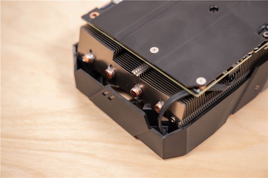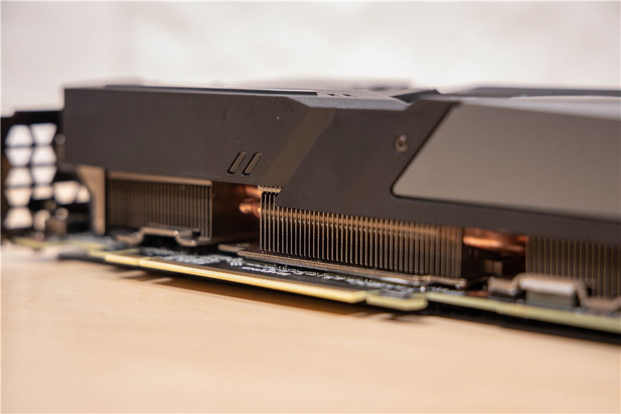 雖然整體造型狹長,但技嘉RTX 2080Ti GAMING OC 11G顯卡的散熱卻不必多操心——因為它很厚。厚度自然來自于散熱系統:高高的散熱鰭片,純銅6熱管,再加上面積極廣的金屬覆板籠罩了絕大部分的發熱組件,技嘉RTX 2080Ti GAMING OC 11G但在散熱硬件方面就令人感到安心。