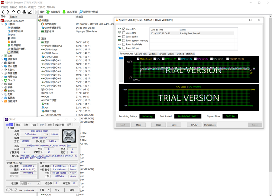 我們將CPU超頻至全核4.8GHz后順利進入了系統,并且通過了30分鐘的AIDA64 CPU烤機測試,證明了技嘉Z390 AORUS MASTER主板在支持i9-9900K在超頻狀態下的穩定性是可靠的。