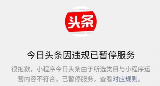 另外,網絡曝光封禁圖中的提示“很抱歉,小程序今日頭條由于所選類目與小程序運營內容不符合,已暫停服務”似乎也能印證事態的真實進展。