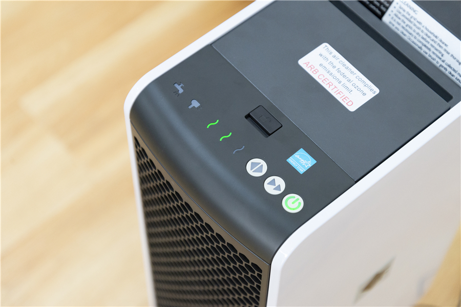在EF AP-360空氣凈化器的頂部,也能夠看到幾顆狀態(tài)指示圖標。左側(cè)是濾網(wǎng)清潔指示燈,中間是風速調(diào)整以及強風模式,最右側(cè)則是電源。