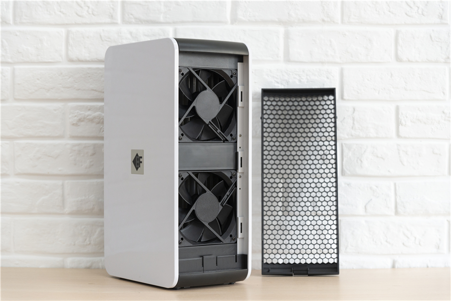 在EF AP-360空氣凈化器的前后兩端都有密密麻麻的格柵,通過格柵下面的按鈕設計你可以直接取出格柵,也就能夠直接看到兩個碩大的風扇。空氣凈化器使用時間長之后難免會積累灰塵影響到凈化器的效能,極簡的拆卸設計讓EF AP-360空氣凈化器可以輕易進行清潔維護。
