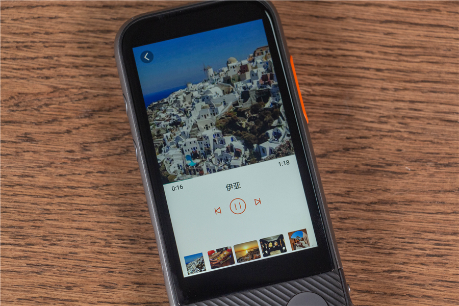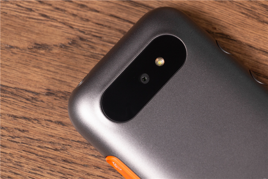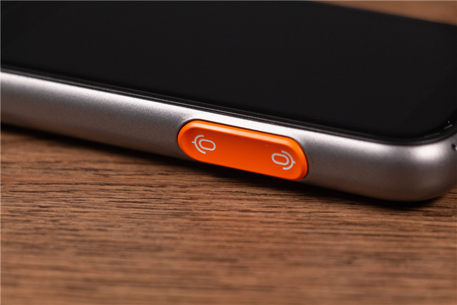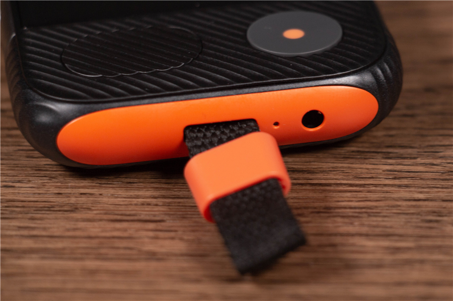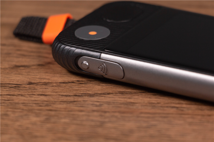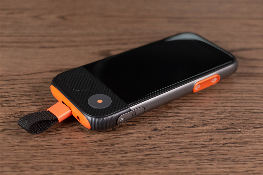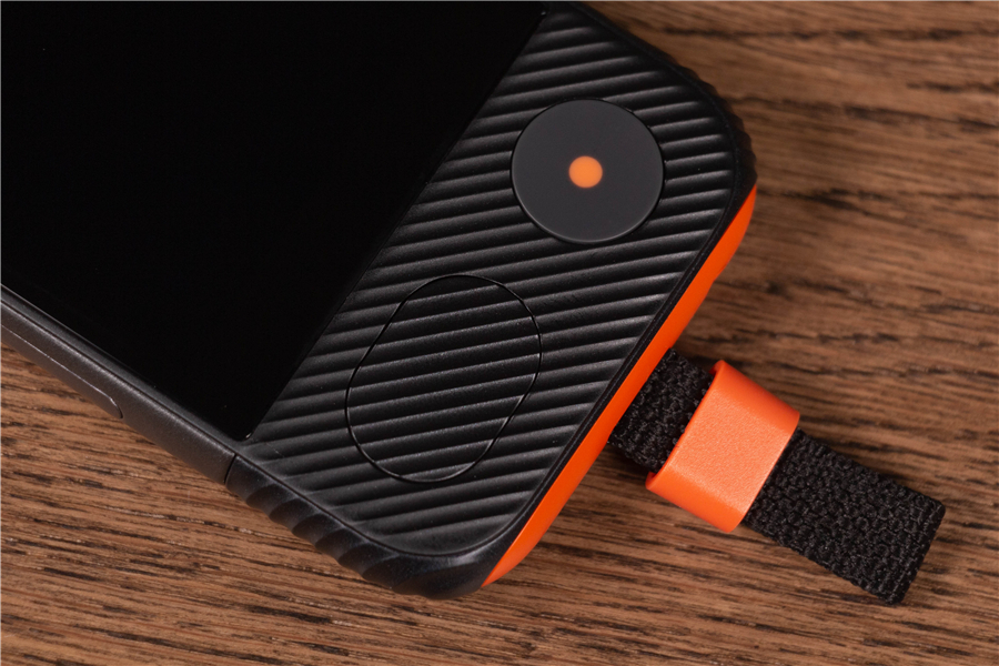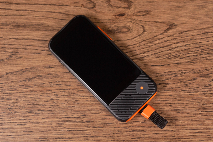 說實話,準(zhǔn)兒Pro的外觀給我的感官很奇妙。圓潤的弧度,刻意粗獷放大的按鍵,以及難以描述的防滑紋+橙黑配色讓它看起來像是一臺功能型手機。準(zhǔn)兒Pro的三圍是14.1*63.8*16.2mm,重量195g,手感相當(dāng)不錯,握在手里也沒有滑脫感。如此看來功能性是它的首要設(shè)計目標(biāo),因此親切的掛繩少不了。