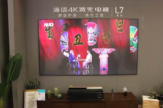 在活動現場我們看到海信展示出的兩款主推激光電視分別為海信4K激光電視L5和L7。其中L5是目前海信的明星產品,80寸的售價已破2萬元。海信L5系列激光電視是在全球首次采用全新DLP 4K顯示芯片方案的產品,在光源技術上L5系列使用全新高集成度封裝激光器,使得光源模組體積減小50%,發光效率提升10%,并采用全新設計超短焦鏡頭,是目前最高效率的激光電視鏡頭,鏡頭效率的提升帶動了主機成本的大幅下降。
