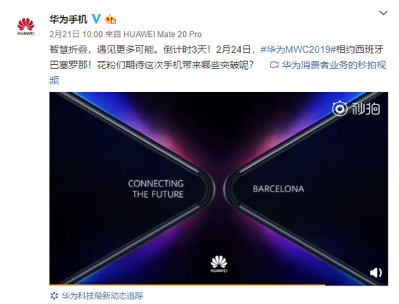 而在手機領(lǐng)域與三星激烈競爭的華為自然也不會對此置若罔聞。華為手機官方微博發(fā)消息稱,華為也將于2月24日于MWC 2019上發(fā)布自家的5G折疊屏手機。