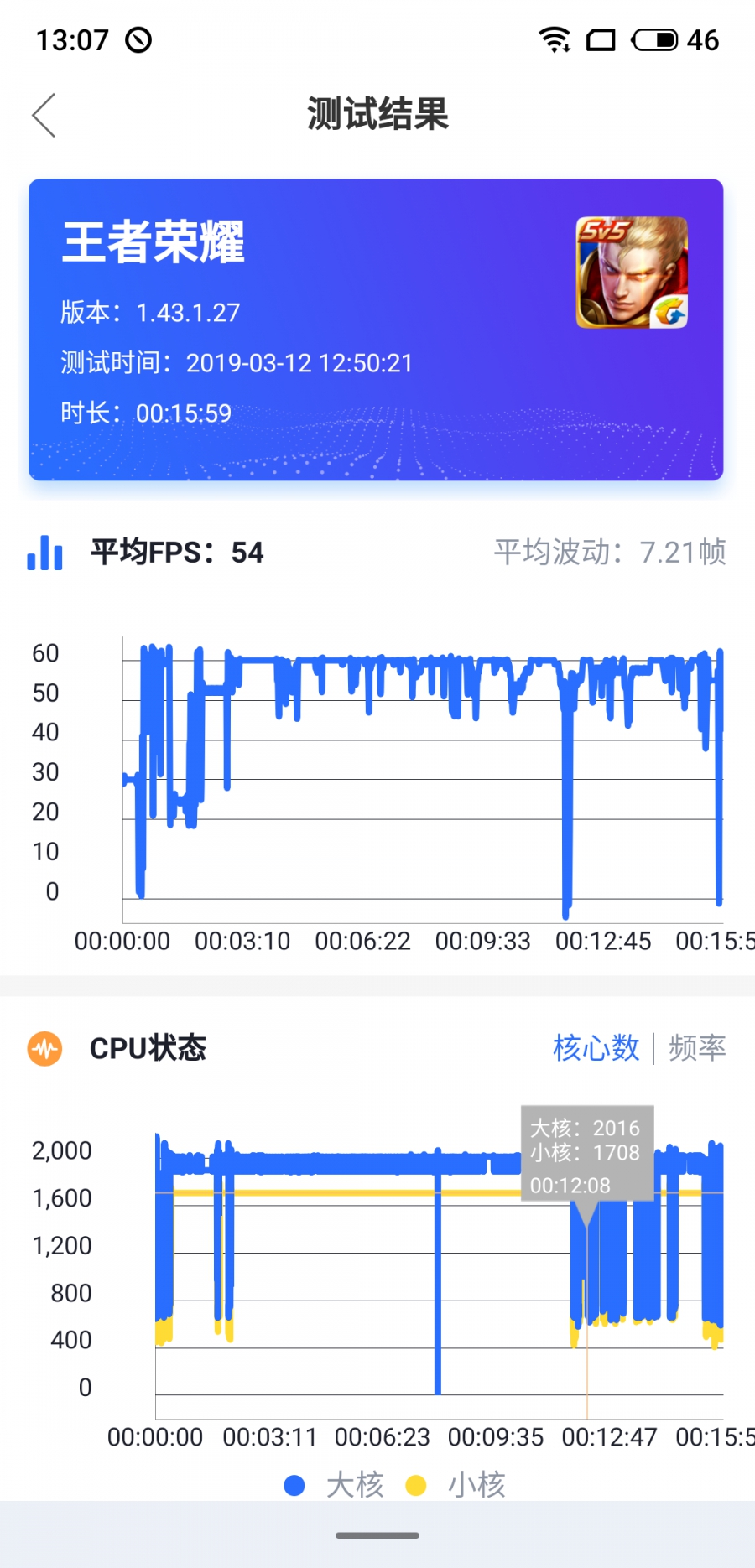 《王者榮耀》開啟超高清畫質的情況下維持在59幀左右,不過團戰波動較大,時不時會出現大幅掉幀的情況。