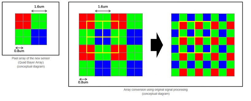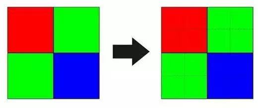 而三星GM1的輸出方式如圖下所示,每個2x2陣列都只能識別同樣的顏色,并且只能一起輸出數據。也就是說,GM1硬件輸出的照片其實跟1200萬像素傳感器輸出的照片沒有本質區別。