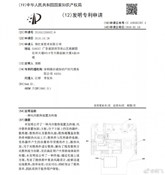 文件顯示,努比亞于2018年10月申請專利,2019年2月獲得專利。專利主要內容是努比亞開發了一套復合式“風冷x液冷”散熱模組,在極小的手機空間內加入風扇設計,主動針對熱源進行干預,迅速帶走熱量。