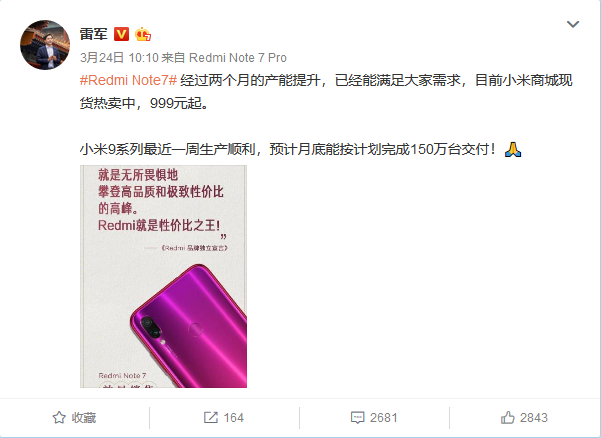 對于小米手機的產能和備貨問題,雷軍在昨天上午(3月24日)再次在微博上發聲,他強調“Redmi Note 7經過兩個月的產能提升,已經能滿足大家需求,目前小米商城現貨熱賣中。”