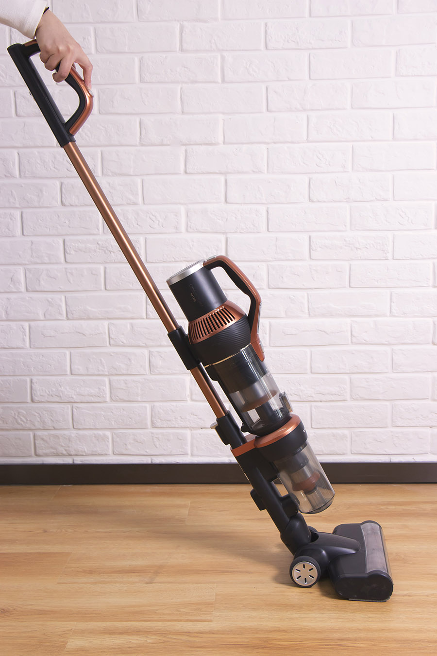 M12采用立式手持組合設(shè)計,重心在下方,增加了滾刷與地面的貼合度,配合機身下部的滾輪設(shè)計,只需輕輕一推,即可輕松搞定地面清潔。地面吸塵時手部幾乎無需用力,就能輕松來回推拉,解決了手持吸塵器由于重心高,拿著重的問題,無需彎腰或蹲下。