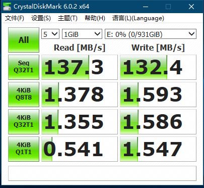 在CrystalDiskMark的測試中,希捷“錦”的讀取速度為137.3MB/s,寫入速度為132.4MB/s。