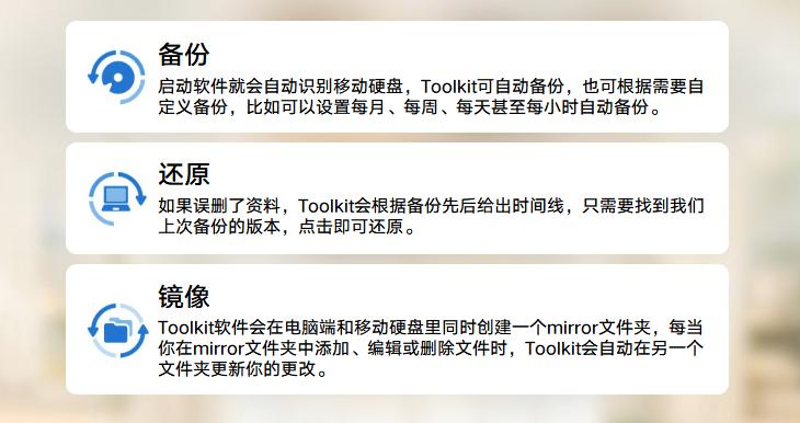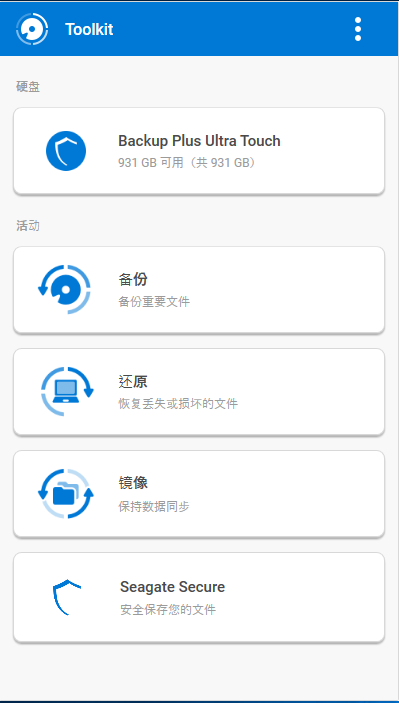 除了密碼設(shè)置外,希捷Toolkit備份軟件還提供了備份、還原、鏡像三個(gè)功能。
