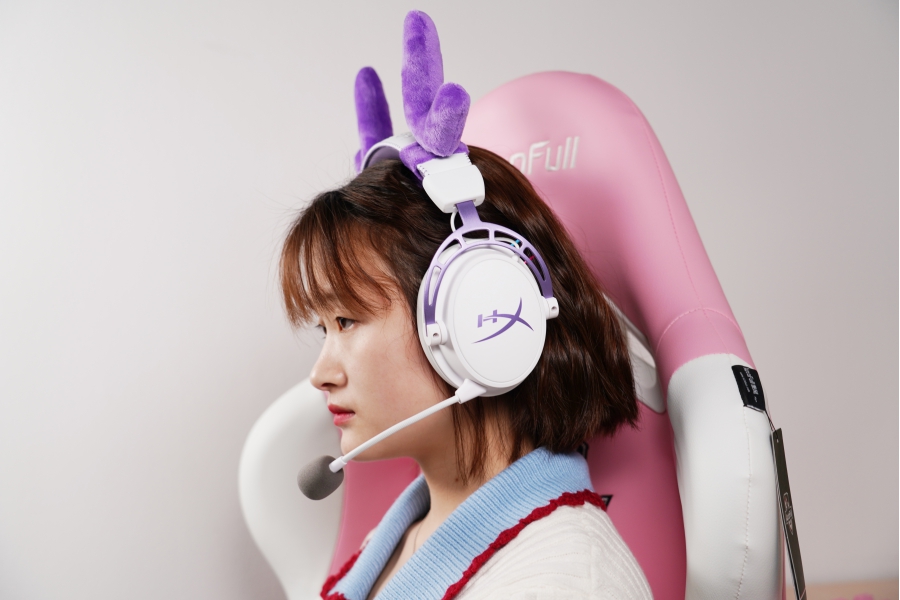 配件方面,HyperX 為其提供有3.5mm耳機連接線、降噪麥克風、PC延長線以及防磨損便攜袋。此外,配套紫晶版還單獨附送了一組“鹿角”配飾,可以固定在耳機頭粱上。