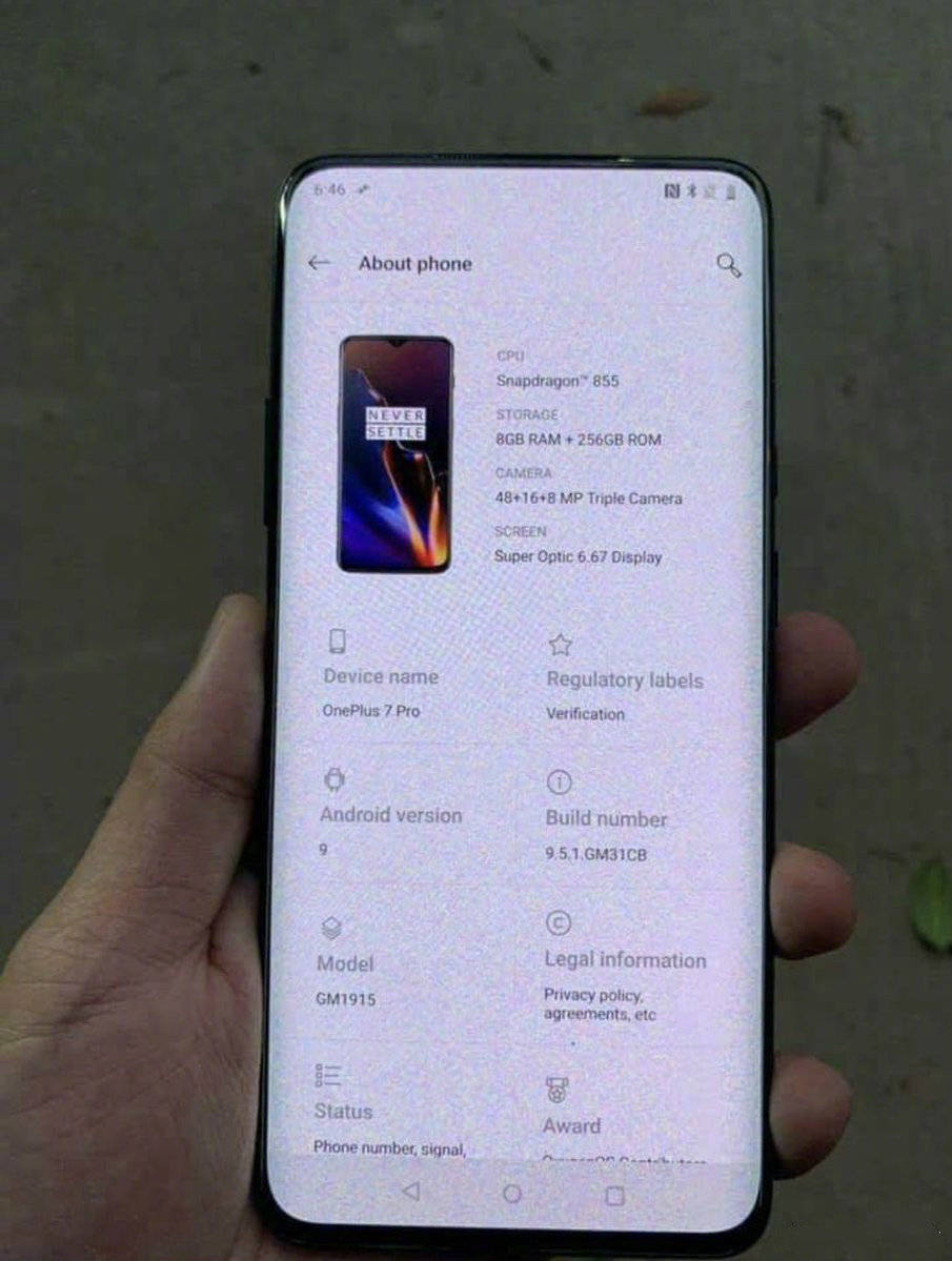 一加7真機曝光:后置三攝+無劉海曲面屏