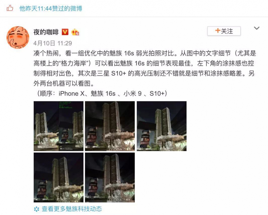 與此同時(shí),有微博網(wǎng)友放出了一組魅族16S拍照樣張,并與iPhone X、小米9以及三星Galaxy S10+進(jìn)行對(duì)比。該網(wǎng)友表示,在弱光下魅族16S的細(xì)節(jié)表現(xiàn)最佳,左下角的涂抹感也控制得相當(dāng)出色,而三星Galaxy S10+的高光壓制還不錯(cuò),但細(xì)節(jié)和涂抹感略差。有趣的是魅族官方微博點(diǎn)贊了這條動(dòng)態(tài)。