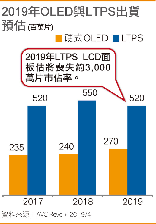 據了解,OLED面板與LTPS LCD面板價格差距降至5美元以內,加上屏幕指紋識別技術的影響,OLED對LTPS LCD面板形成全面壓制局面。根據AVC Revo數據顯示,2019年LTPS LCD面板將喪失約3000萬片左右的市場占有率,影響較大。