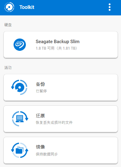 我們可以在希捷官網(wǎng)下載這款軟件來(lái)對(duì)硬盤(pán)進(jìn)行安全設(shè)置,Toolkit備份軟件為銘系列提供有備份、還原和鏡像三個(gè)功能。其中還原功能,可以在誤刪或數(shù)據(jù)丟失后對(duì)其進(jìn)行找回,當(dāng)然前提是對(duì)缺失文件有過(guò)備份處理。而鏡像功能則是將硬盤(pán)文件實(shí)時(shí)同步到本地設(shè)備中,當(dāng)硬盤(pán)不在身邊的時(shí)候也能滿(mǎn)足你對(duì)現(xiàn)有文件的調(diào)用需求。