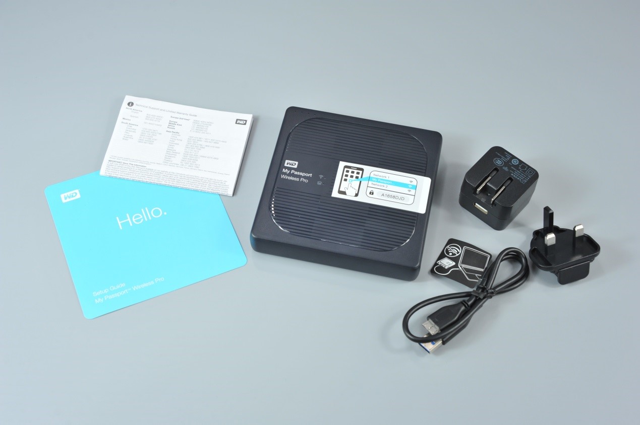 拆掉包裝,里面有My Passport Wireless Pro,一根USB 3.0數(shù)據(jù)線,一個USB電源適配器,一份快速安裝指南,以及一份技術(shù)支持與有限保修指南。