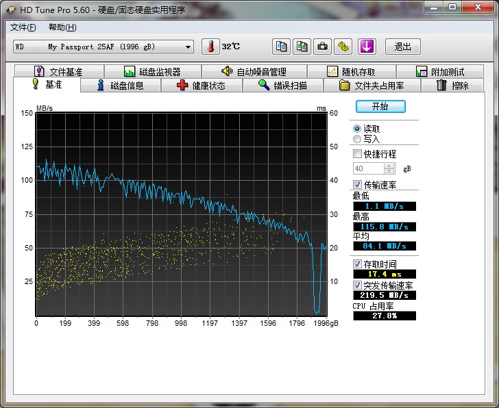 HDTune Pro測試平均讀取速度為84MB/s