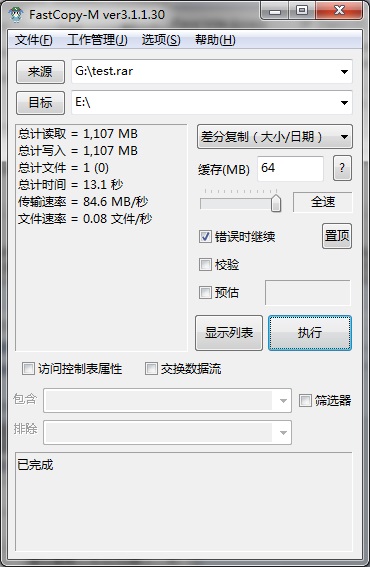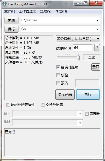 最后我們使用FastCopy來測試下真實的文件拷貝速度,測試結(jié)果為讀取84.6MB/s,寫入33.8MB/s