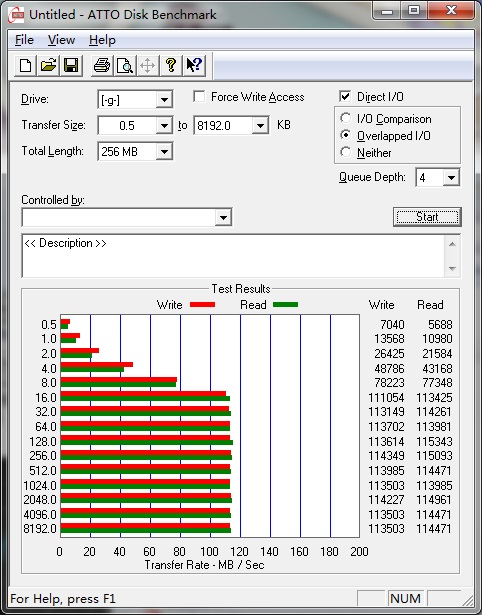 ATTO Disk Benchmark測試寫入為113MB/s,讀取速度為114MB/s